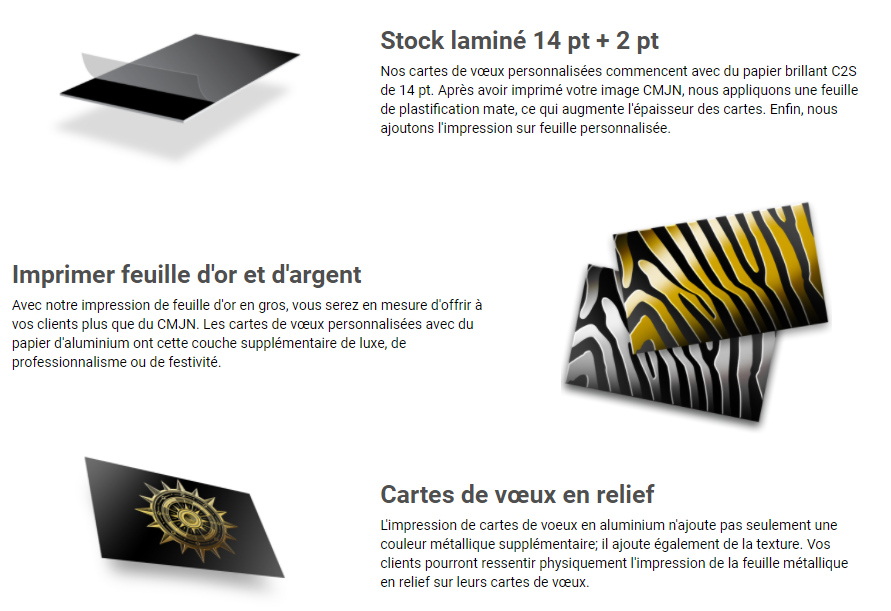Le même principe s'applique pour les autres options comme l'embossage, le débossage et l'estampage métallique. Chacune de ces options nécessite un fichier séparé représenté par la couleur 100% noir pour montrer où l’option sera appliquée.