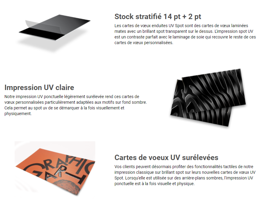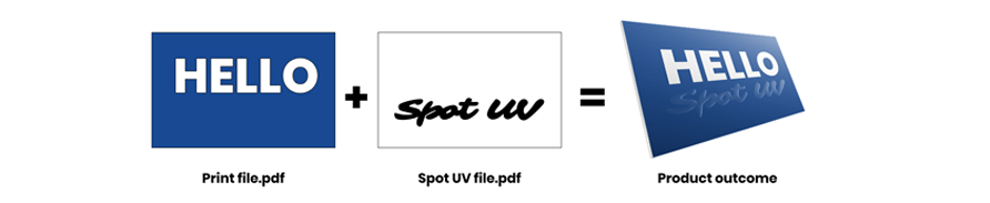 Le positionnement du spot UV ne peut pas être garanti à 100%. Veuillez noter qu'il peut y avoir un décalage d'environ 1/16 "dans la position UV du spot sur le produit imprimé.